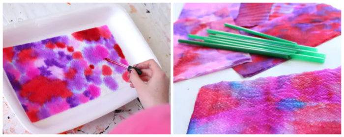 Попросите детей капать акварелью на туалетную бумагу, пока она полностью не станет насыщенного цвета.