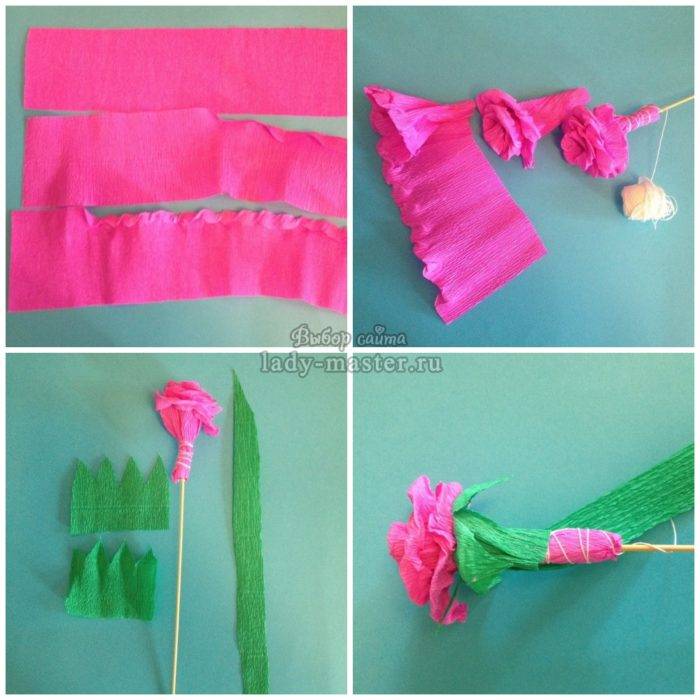 - гофрированная бумага розового (красного, желтого, оранжевого, белого, алого, синего) цвета для розы и зеленого для листьев и стебля,