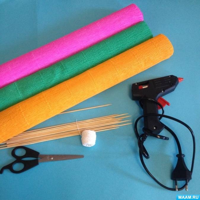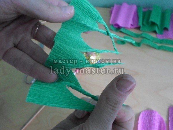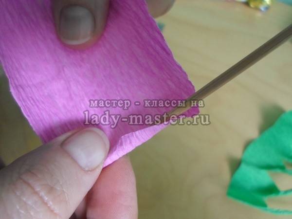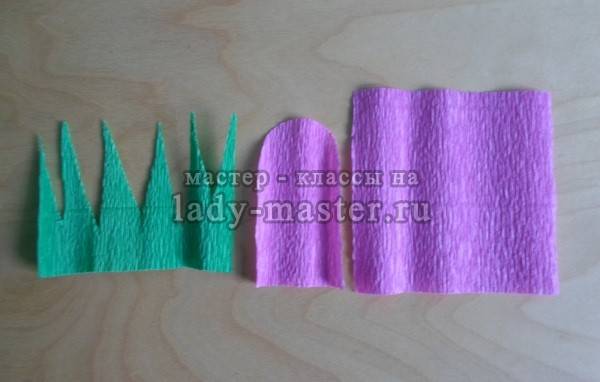 Для него используют гофрированную цветную бумагу. Если ее нет, подойдут салфетки нужного цвета или туалетная бумага без тисненого рисунка. Мягкий материал легко гофрируется, хорошо держит форму. Для получения складок бумагу сбрызгивают водой, накручиваю на карандаш, сжимают с разных сторон. Когда салфетка или туалетная бумага немного подсохнет, ее расправляют, она готова к работе. Для листиков подойдут любые оттенки от салатового до болотного.