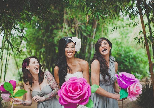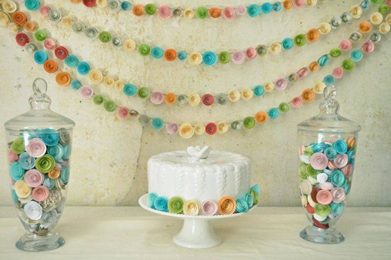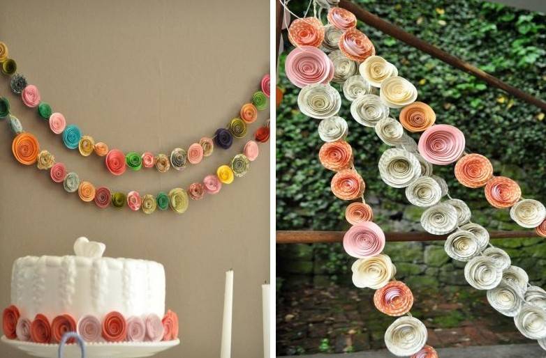Для такого украшения отлично подойдут спиралевидные розы – они и смотреться будут презентабельно, и изготовить такие элементы проще простого. Сделайте в цветах отверстия при помощи шила или иглы, а затем нанижите их на веревку или леску. Красиво и легко!