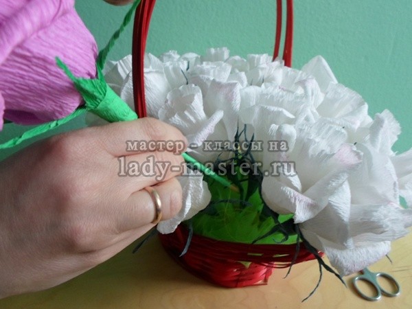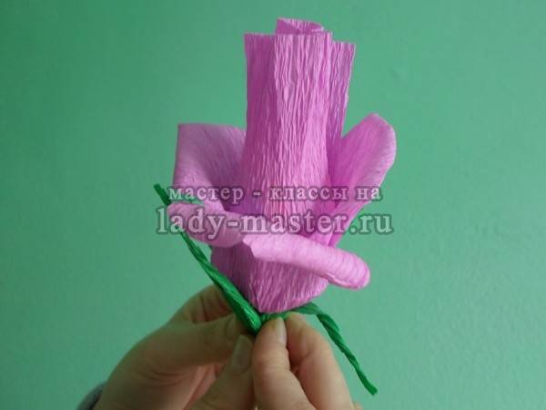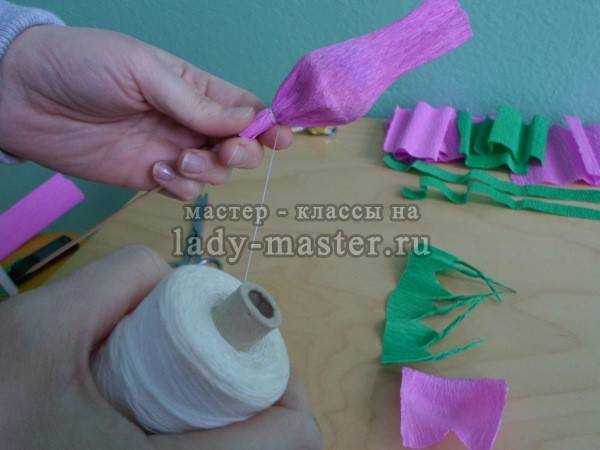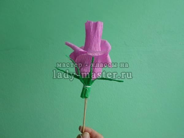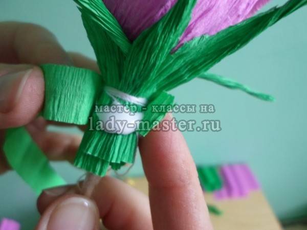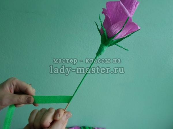 - Зеленой лентой, тонкой полоской из гофрированной бумаги или зеленой нитью обернуть несколько раз основание бутона, создавая чашелистик.
