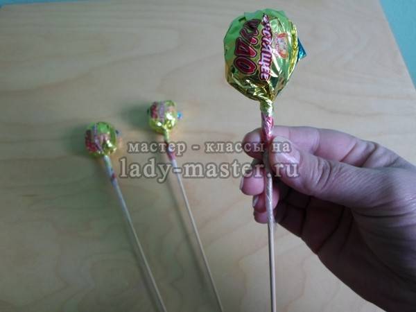 ШАГ 2. Нанизываем на шпажку конфету с той стороны, где остался хвостик обертки. Стараемся не попасть в саму конфету из гигиенических соображений. Плотно фиксируем конфету на шпажке скотчем.
