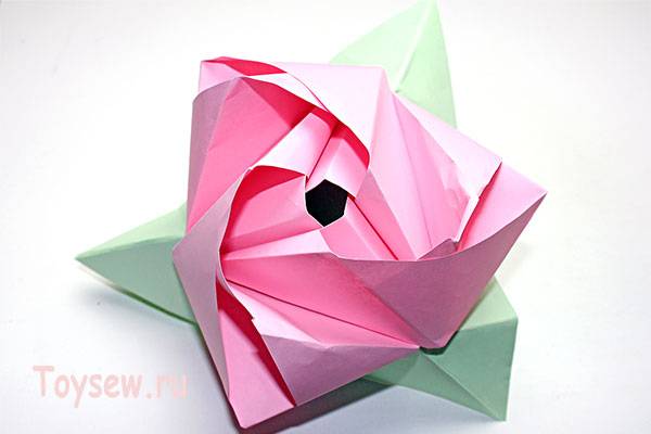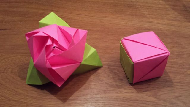 Вытянув все, расправьте центр, потом края, чтобы каждый завиток был заметен. Вот как сделать оригами из бумаги розу, способную превратиться обратно, в двухцветный куб.