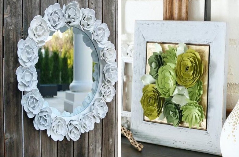 Попробуйте сделать розочки в различных размерах и оттенках, подбирая при этом одну цветовую гамму, а затем закрепите их на рамке.