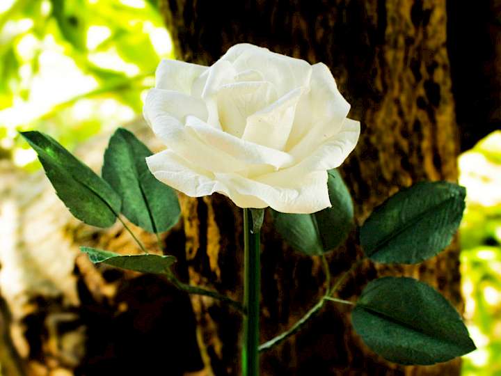 Шаг 3. На уже заранее подготовленную заготовку из проволоки надо наклеивать лепестки, предварительно придав им форму настоящих лепестков. Для придания такой формы можно воспользоваться ножницами. После того как лепестки окажутся на стебле и роза будет напоминать настоящую, необходимо побрызгать цветок парфюмом с соответствующим ароматом. Роза готова! Таким подарком можно удивить девушку, маму или сестру. А главное, долговечность такого цветка гарантирована!