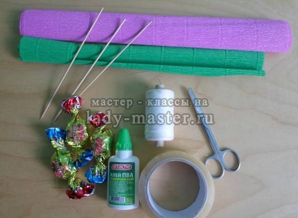 ШАГ 1. Для изготовления букета нам понадобится гофрированная бумага зеленого цвета для листьев роз и стебля. Цветы делаем из бумаги любимого вами цвета роз. Или же подбираем любимый цвет того человека, которому предназначен букет. В нашем случае бумага розового и белого цвета. Далее нам понадобятся деревянные шпажки для стебля, клей ПВА, ножницы, нитки, скотч и сами конфеты. Конфеты будут играть роль сюрпризного момента. Фантик конфет с одной стороны заклеиваем скотчем. Обязательно должен остаться один хвостик.
