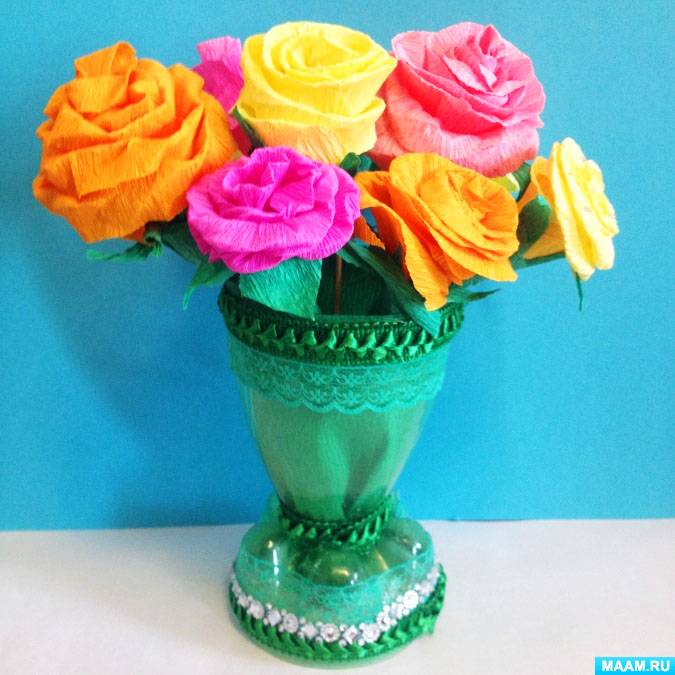 Попробуйте сделать цветочный букет из роз, внутри которых завернуты конфеты. Сам букет можно поместить в вазу, сделанную своими руками, либо в элегантную корзиночку. Пошаговая инструкция поможет вам справиться с несложным заданием.