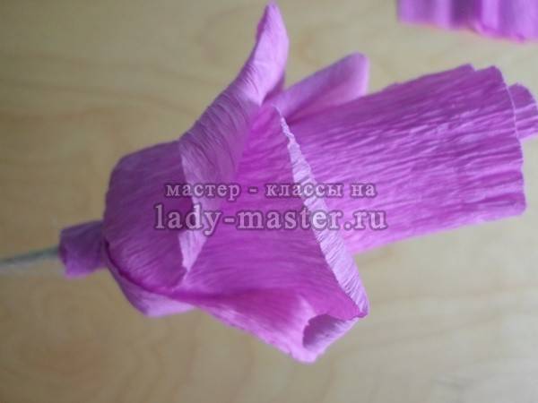 Получившуюся полосу начните закручивать на шпажку. Нижнюю часть — туже, а верхнюю слабее, придавая форму цветка. Зафиксируйте ниткой или проволокой.