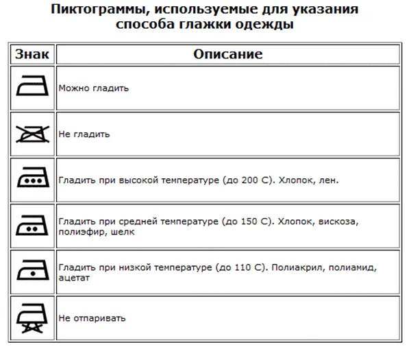 Производители указывают критерии ухода в виде пиктограмм, на которых также указаны параметры глажки.