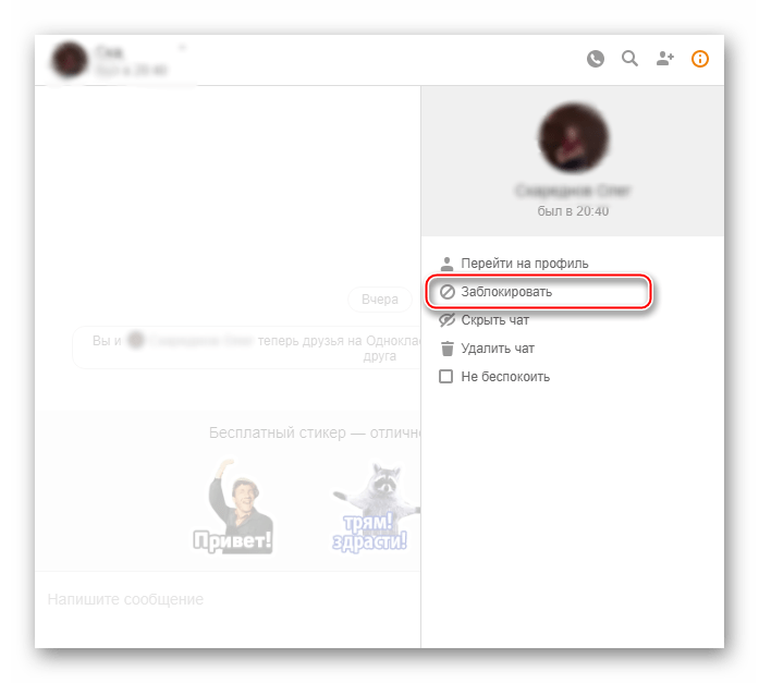 Мобильная версия Одноклассников не позволяет заблокировать пользователя напрямую из диалога.