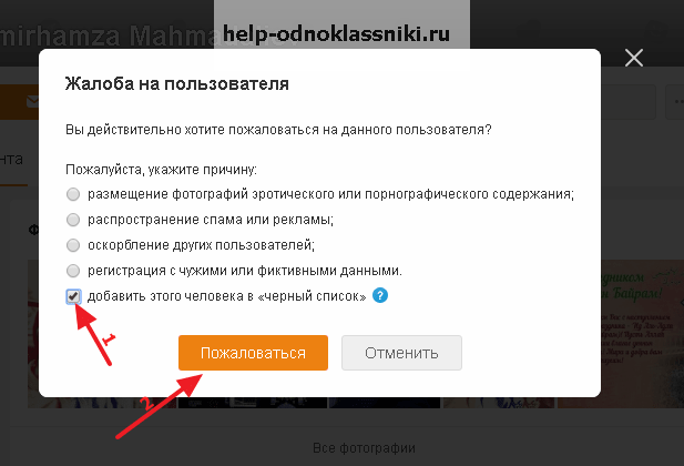 - Дальше предварительно ставится галка, которая добавляет человека в черный список (2 на рис. 2), и
