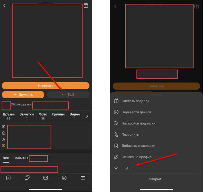 Порядок действий такой же, как и в браузере: необходимо найти иконку троеточия и вызвать контекстное меню. Социальная сеть вновь предложит передать подарок, перевести деньги или позвонить. Но, если нажать на кнопку «Еще», то появятся и дополнительные пункты меню, включая «Заблокировать» и «Пожаловаться».