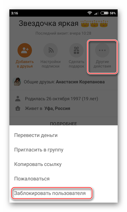 Чтобы добавить пользователя в Одноклассниках с его страницы в “Черный список” через мобильное приложение, проделайте следующие действия: