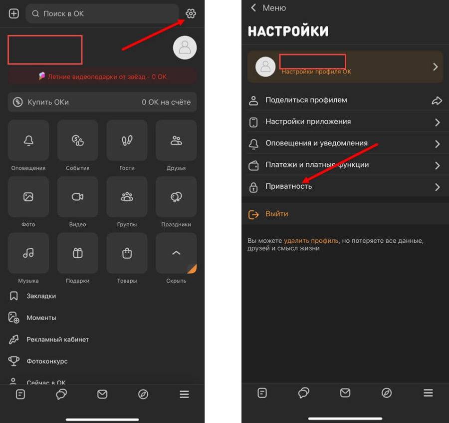 Заблокированные пользователи, как и на ПК, сразу попадают в «Черный список». И, как и в браузере, никто не мешает менять статус тех, кто попал в ЧС. Достаточно перейти в настройки (шестеренка справа сверху на странице личного профиля) и раскрыть раздел «Приватность».