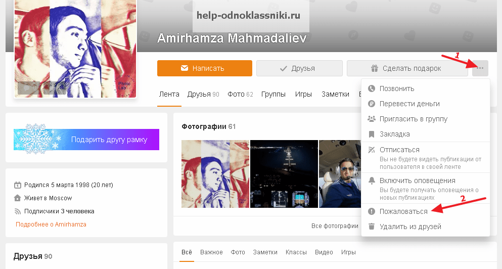 Рис. 1. Открываем профиль нарушителя в ОК и находим кнопку «Пожаловаться»
