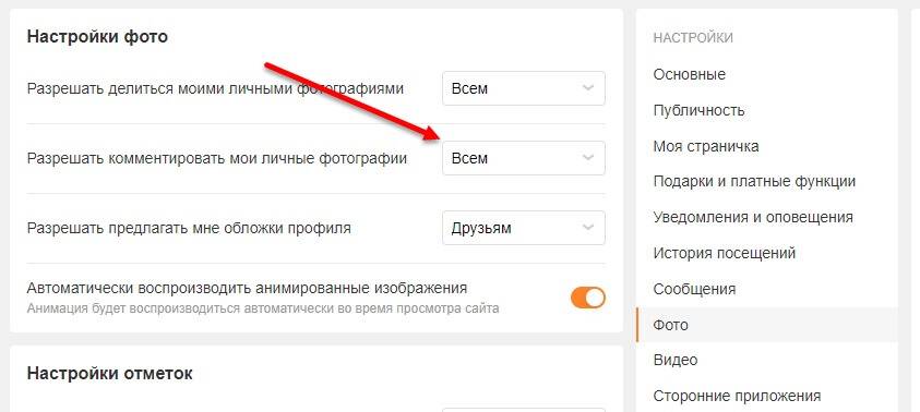 По схожему сценарию настраиваются и другие разделы в «Одноклассниках»: те же «Фотографии» или «Видеоролики». Если перейти в категорию «Фото», то социальная сеть разрешит заблокировать комментарии под фотографиями от всех, кроме друзей.