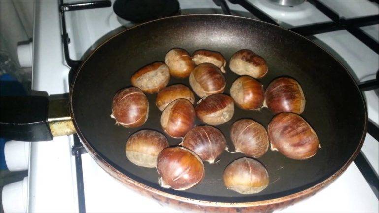 - После этого подготовленные каштаны складываются в сковородку или на жаровню и готовят так около получаса.