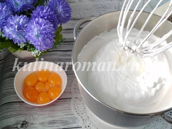 Отделить желтки от белков, взбить белки в пену с сахарным песком. Половину сахара в белки, а вторую часть взбиваем с желтками, до растворения сахара. Взбиваем до бела.