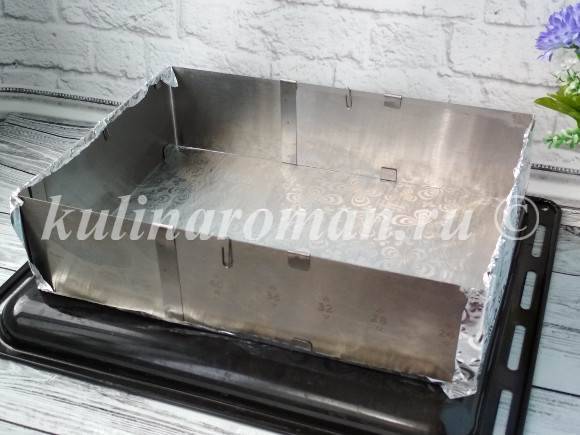 10. Позаботьтесь заранее о форме. Если у вас форма без дна, тогда ее необходимо завернуть в фольгу (сделать дно). А, если у вас разъёмная форма, тогда выстелите только дно формы пергаментом. И ничем не смазывайте. У меня для бисквитного теста на 8 яиц сегодня прямоугольная форма 24 на 33 см. Я планирую разделить данный бисквит на 3 коржа.