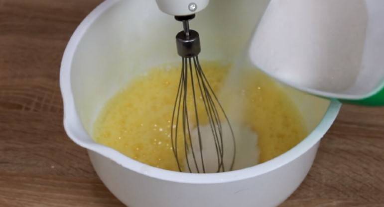 Итак, все четыре яйца вбиты, включаем миксер сначала на маленькую скорость, затем постепенно увеличиваем до максимальной. Взбиваем до тех пор, пока яйца не станут пышной пеной — и только потом тонкой струйкой добавляем сахарный песок.