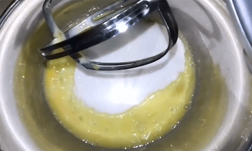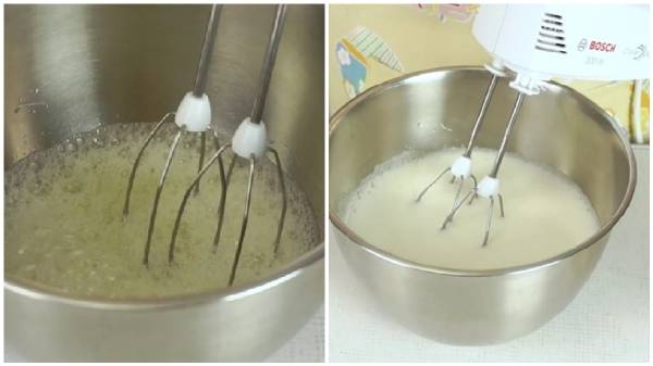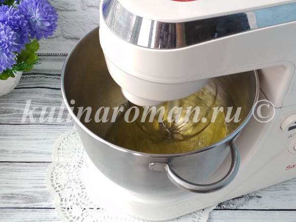 Миксер во время добавления сахара выключать не нужно, так как, сахарный песок не должен осесть на дно.