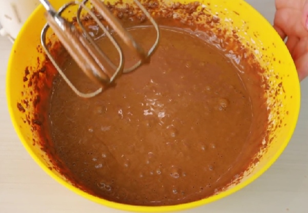 Сначала половину, перемешать миксером на самой маленькой скорости. Влить тонкой струйкой молоко с маслом, не переставая мешать. Добавить вторую половину смеси муки и какао. Хорошо соединить и в завершении налить кипяток. Довести до однородного состояния.
