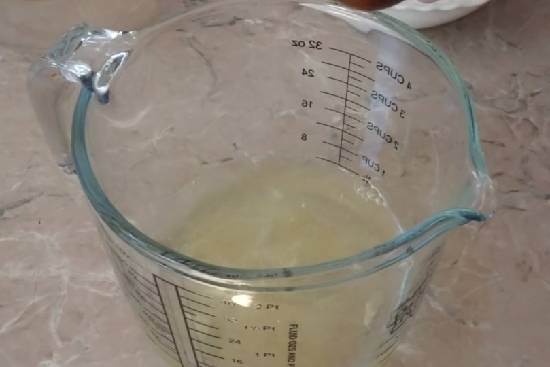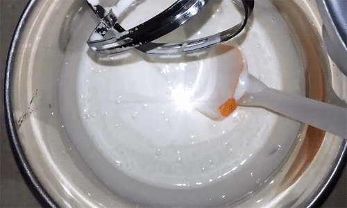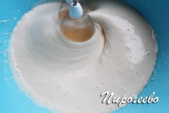 - Пока мы взбиваем не останавливаясь, постепенно добавляем кипяток и продолжаем взбивать