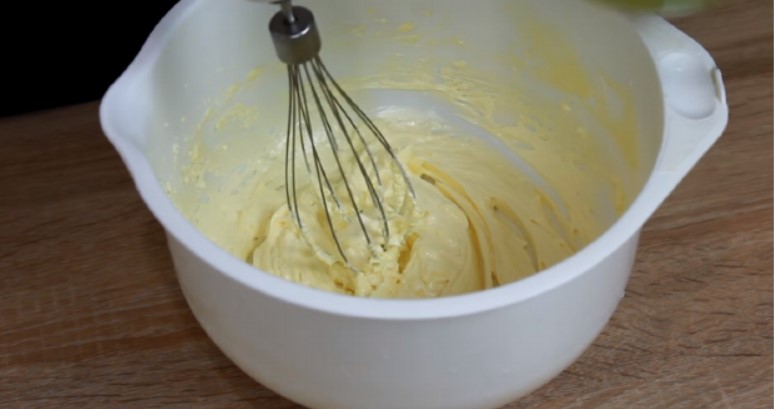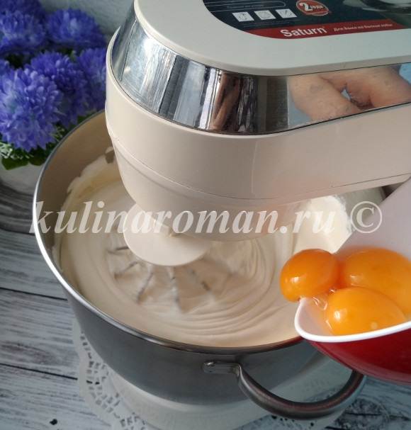 5. Самое время добавлять желтки. Желтки добавляем по одному и, при этом, скорость миксера снизить до средней.