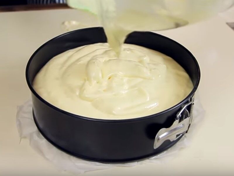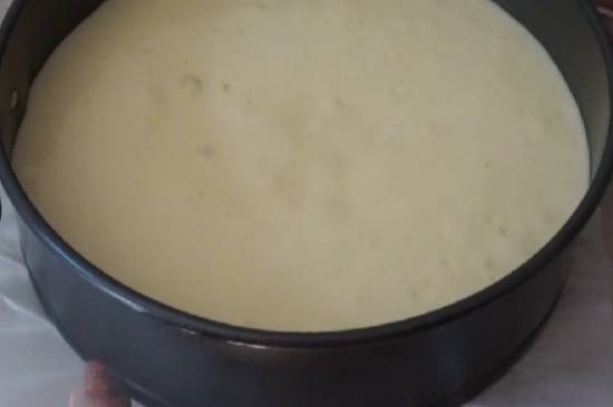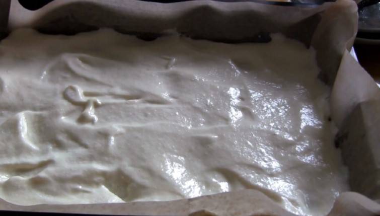 Все делаем быстро и аккуратно, отправляем в форму, немного трясем ее, чтобы все равномерно распределилось по емкости. Дно я застелила пергаментом, бока смазала растительным маслом.