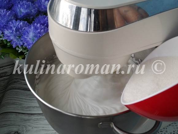 2. Когда белки станут вот такие воздушные и объёмные, вводим сахар. Сахар следует добавлять частями.