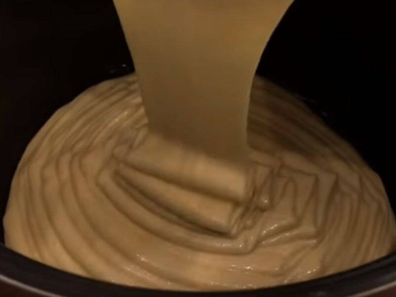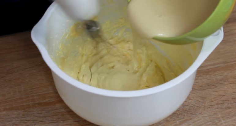 5. После вливать в крем сгущенку, продолжая работать миксером. В итоге должен получиться однородный, полужидкий, чуть маслянистый топинг. Можно использовать вареное сгущенное молоко, это придаст десерту карамельный вкус