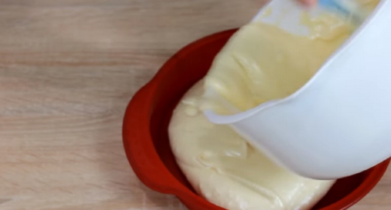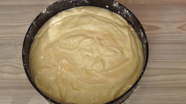 Теперь выливаем тесто в заранее подготовленную форму (нужно смазать кусочком сливочного масла и присыпать мукой, лишнюю стряхнуть). Несколько раз постучите об стол, чтобы тесто распределилось от середины к краям ровнее. Можно резким движением крутануть форму по часовой стрелке, с той же целью.