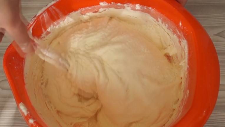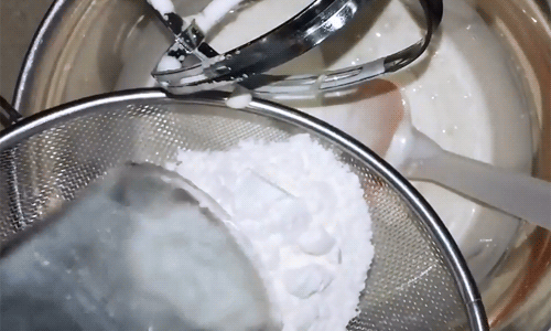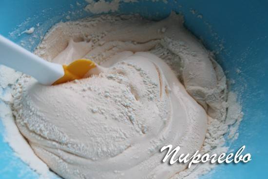 Муку добавляйте частями, в три подхода. Каждый раз после добавления муки, перемешивайте ингредиенты движениями снизу вверх, как будто приподнимаете тесто слоями. Миксер при добавлении муки не используем, только лопатку или деревянную ложку.