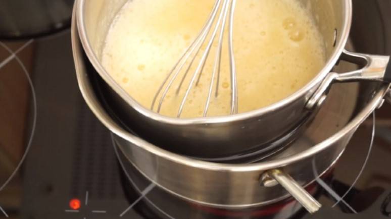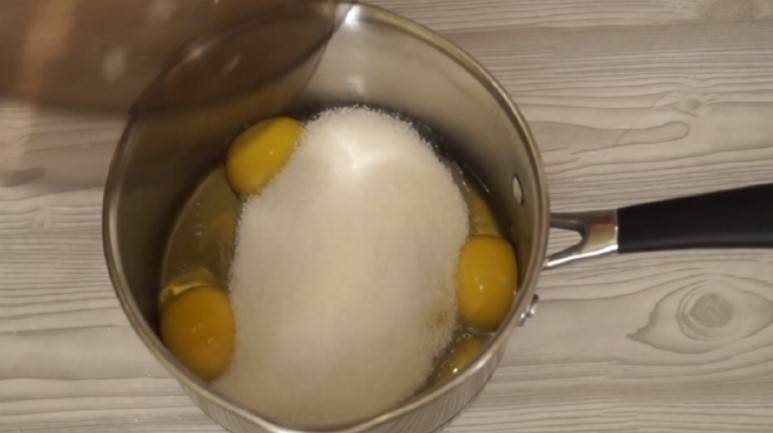 Сначала надо взбить одни яйца до ровного цвета. Затем порциями добавить сахар и смешивать миксером до полного его растворения. Должна получиться беловатая ровная масса, больше по объему вдвое, чем стартовые продукты.