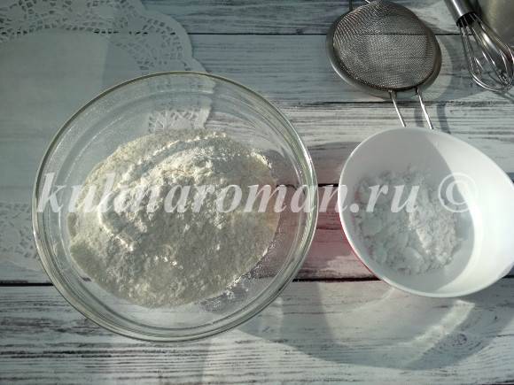 В муку всыпаем разрыхлитель, смешиваем и просеиваем. При просеивании мука очищается от возможного мусора, насыщается кислородом и приобретает более мелкую и воздушную структуру.