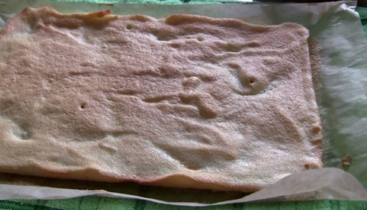 Застилаем форму пергаментом, выливаем тесто и распределяем его длинным ножом, чтобы получилась ровная поверхность. Отправляем в духовку, разогретую до 210° минут на 10-12. Сворачиваем горячий пласт в рулет вместе с пергаментом.