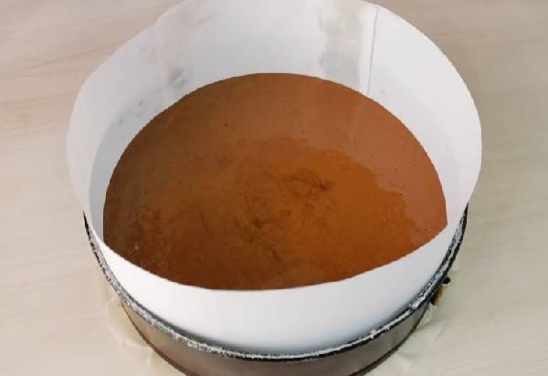 Разъёмную форму для выпечки диаметром 20 см выстилаем пекарской бумагой, дно и стенки ничем не смазываем. Перекладываем однородную массу, слегка встряхиваем, крутим по часовой стрелки, таким образом, равномерно заполняя все пустоты.