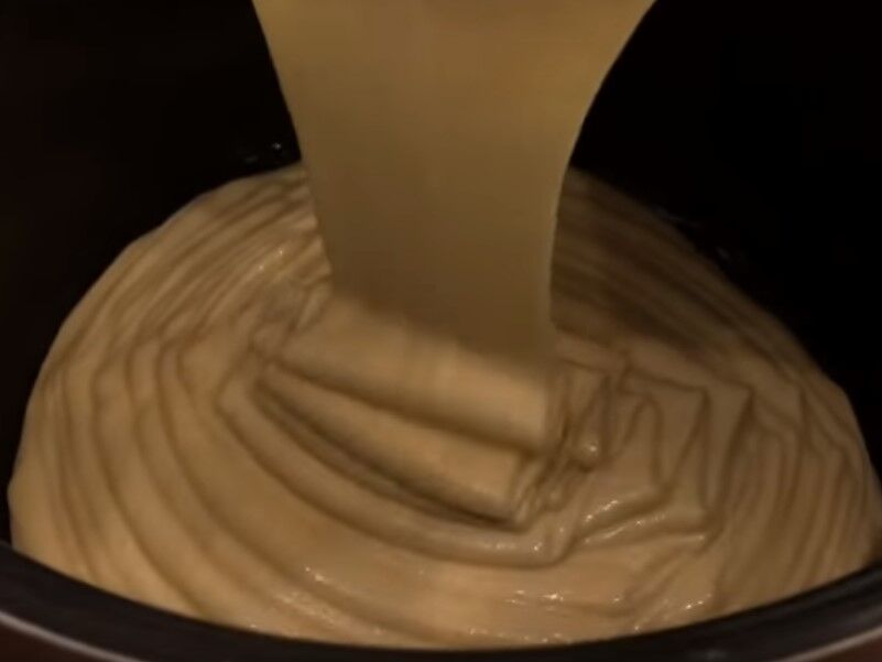 5. После вливать в крем сгущенку, продолжая работать миксером. В итоге должен получиться однородный, полужидкий, чуть маслянистый топинг. Можно использовать вареное сгущенное молоко, это придаст десерту карамельный вкус