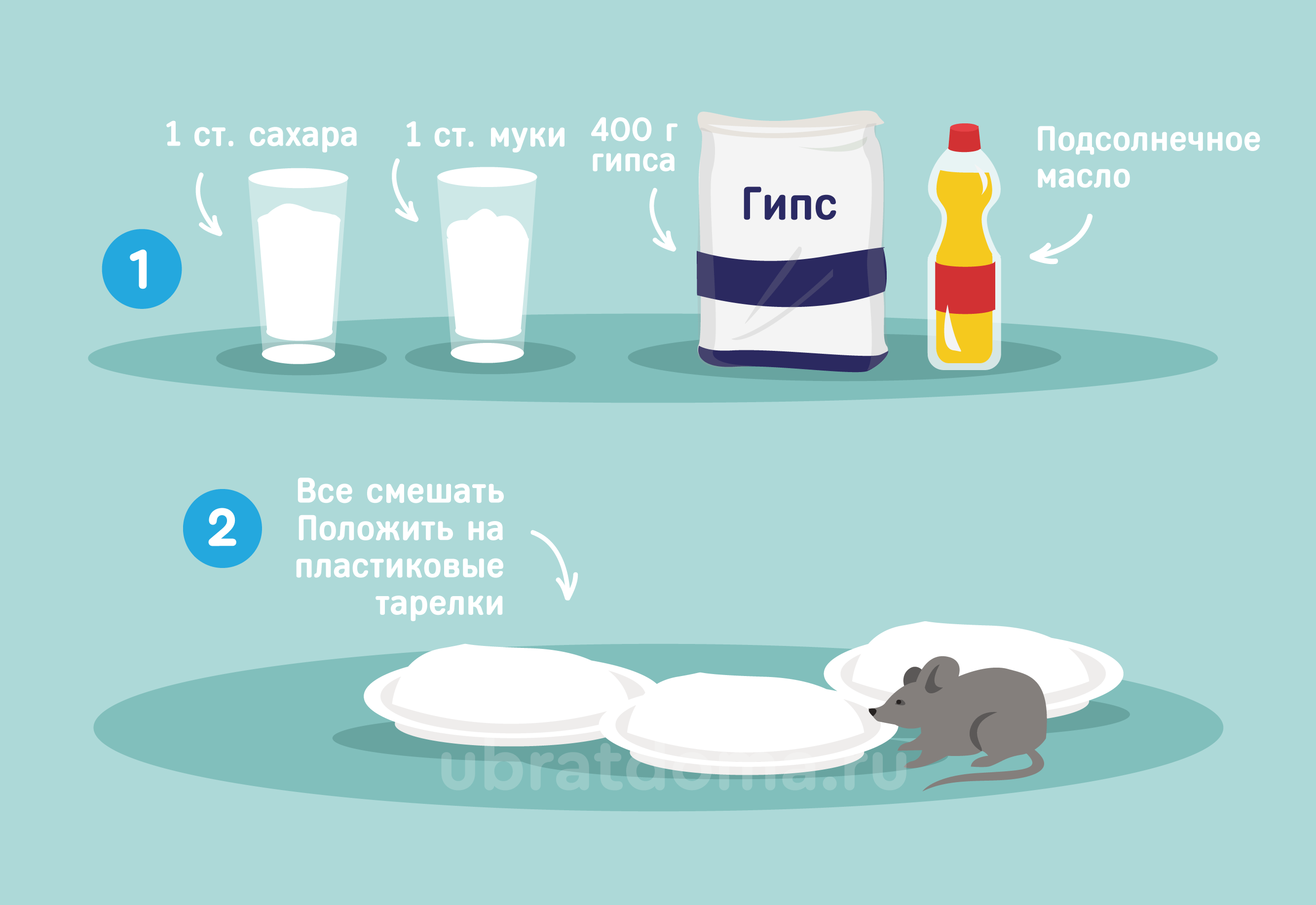 Смешайте 200 г сахара, 300 г муки, 500 г гипса и расставьте на блюдцах в доме. Мыши наедятся «вкусняшки» навсегда! Однако, если у вас есть кошки и собаки в доме, не стоит рисковать с угощением.