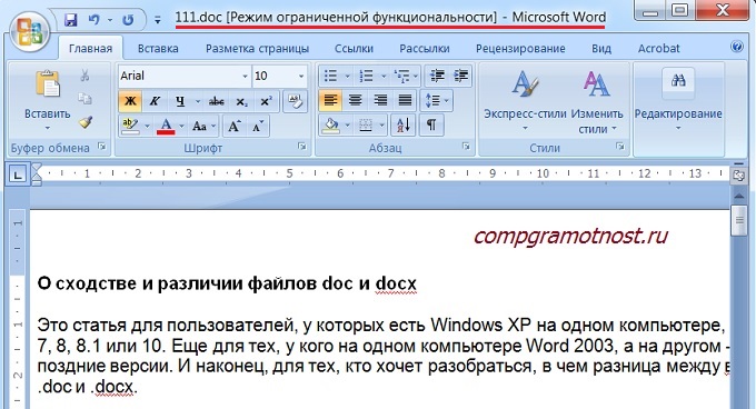 Именно поэтому, если файл со «старым» расширением.doc открыть с помощью Word 2007 (или более поздней версии), то неожиданно сверху можно увидеть надпись «Режим ограниченной функциональности