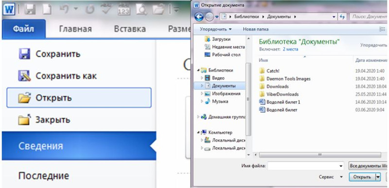 Открытие документов текстового редактора