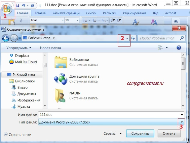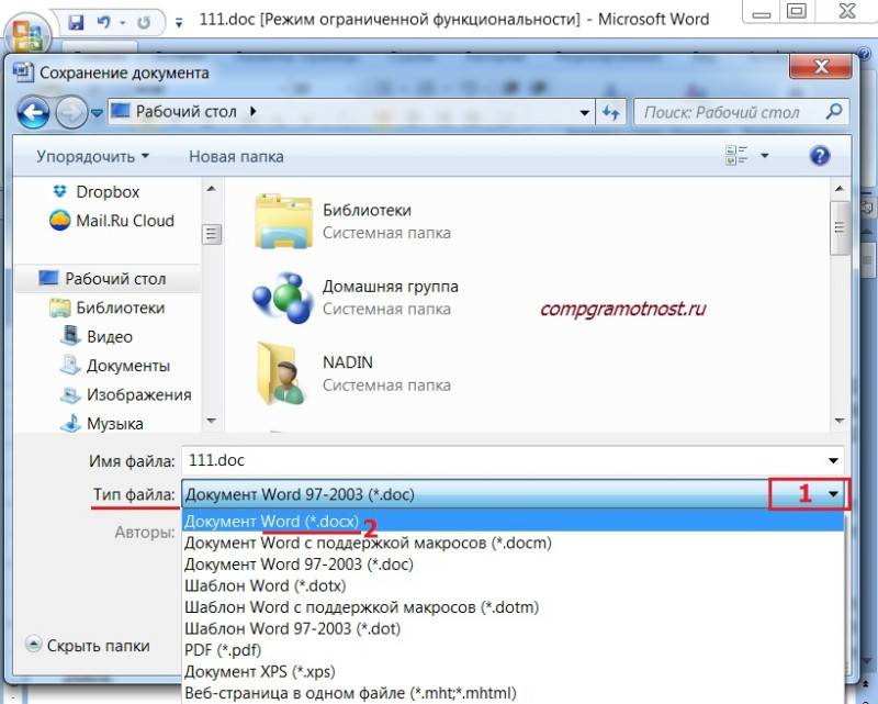 Рис. 2 Как файл со «старым» расширением.doc сохранить с «новым» расширением.docx или наоборот сохранить.docx в.doc