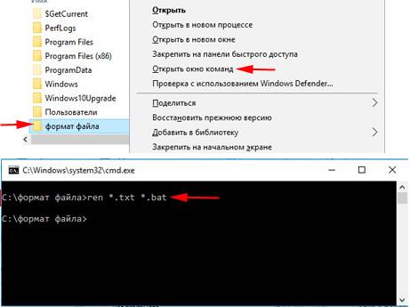 Исправить расширения группы файлов можно, открыв cmd. Для этого зажмите клавишу Shift, кликните правой кнопкой мышки по папке с файлами для переименования в Проводнике, выберите «открыть окно команд». В cmd напечатайте команду ниже, кликните Enter: