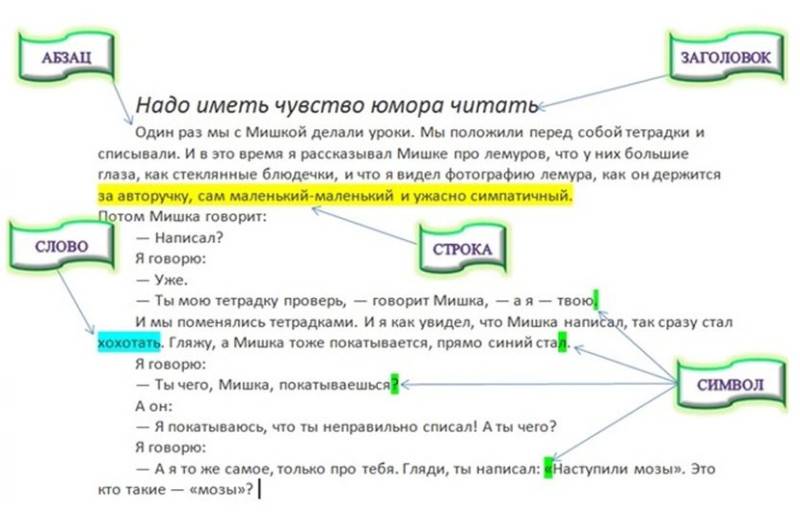 В набранном тексте можно выделить основные структурные элементы: символ, слово, строку, абзац.