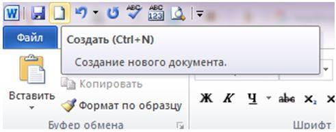 - На панели быстрого доступа выбрать значок чистого листа и кликнуть, либо нажать на клавиатуре комбинацию клавиш Ctrl+N.