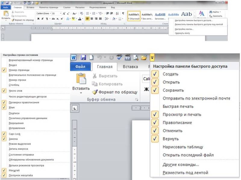 Настроить ленту команд, панель быстрого доступа, строку состояния можно, вызвав на них контекстное меню: