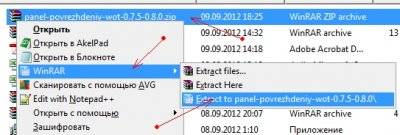 Распаковываем архив с модом (правая кнопка мышки на файле, до этого устанавливаем архиватор