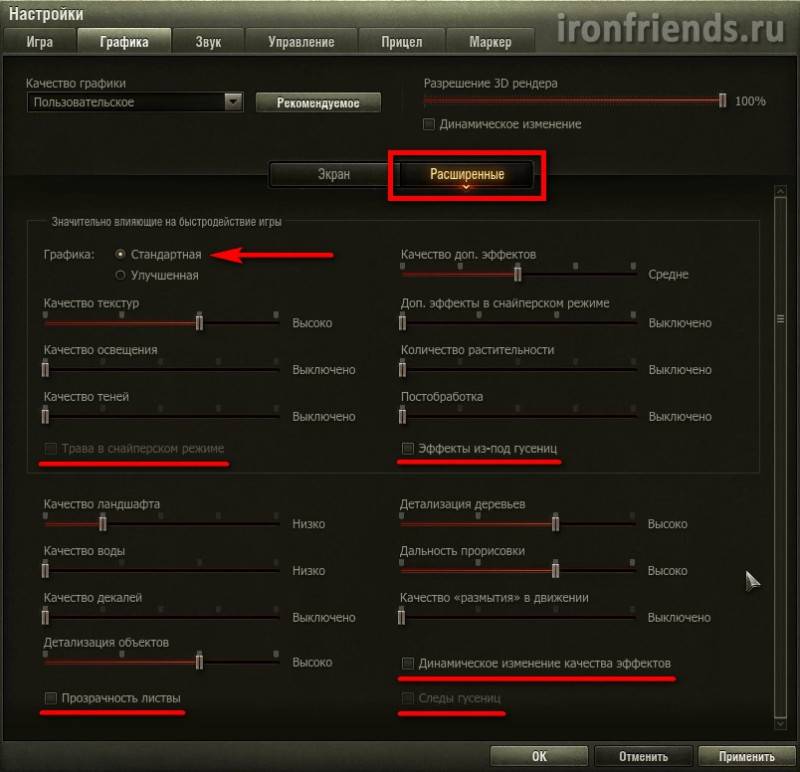 Также рекомендую отключить траву и эффекты в снайперском режиме (они очень мешают), прозрачность листвы (делает игру еще чище и быстрее), следы и эффекты из-под гусениц (на них вообще никогда не смотришь). «Качество доп. эффектов» лучше не ставить выше среднего или вообще отключить, так как они тоже мешают (например, при разрыве рядом снаряда от арты). Галочку «Динамическое изменение качества эффектов» лучше снять, ни к чему чтобы графика в игре плавала.