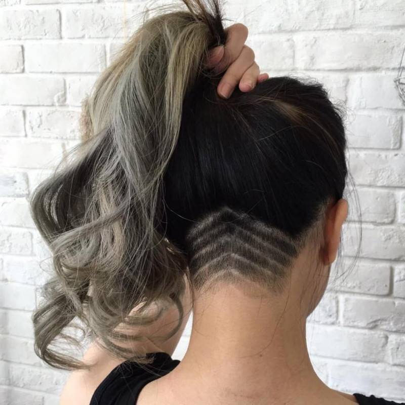 Аналогичный предыдущему вариант того, как красиво подстричь длинные волосы с использованием необычного дизайнерского подхода. В данном случае сбривается нижняя часть затылка, спрятанная под волосами. Здесь также используются различные узоры при сбривании: геометрические фигуры, абстракции, надписи, цветы, животные. Особенно необычно и красиво такие узоры будут выглядеть, если они выполнены плавным переходом, становясь все более четкими от шеи к затылку.