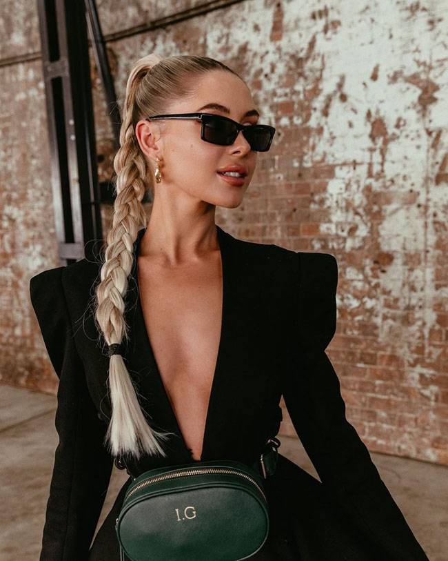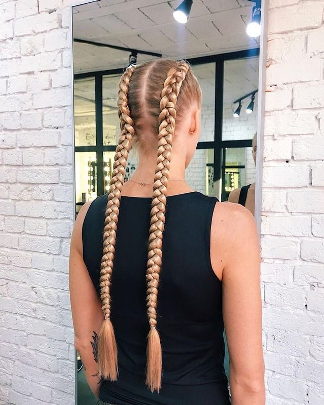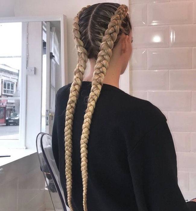 Боксерские косы идеальны для женщин предпочитающих спортивный стиль. Но и с женственным платьем или юбкой они тоже будут выглядеть стильно. Заплетите косы, с прямым пробором, зафиксируйте тонкой резинкой-невидимкой кончик, и на весь день вам гарантирован идеальный вид.